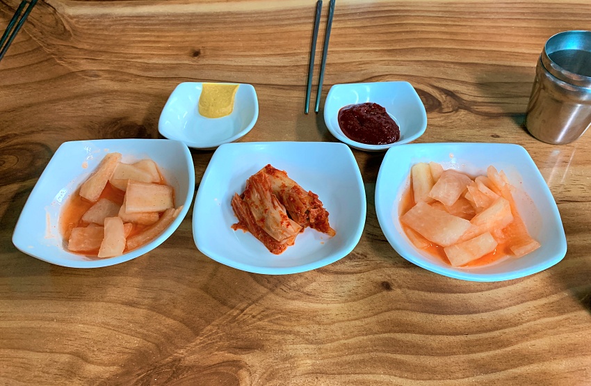 겨자, 양념장이 함께 나오는데 이건 수육을 위한 소스다. 심심한 깍두기와 김치, 제주는 생각보다 무우 생산을 많이 하는 곳이다. 그리고 제주 무우는 달고 맛나다.