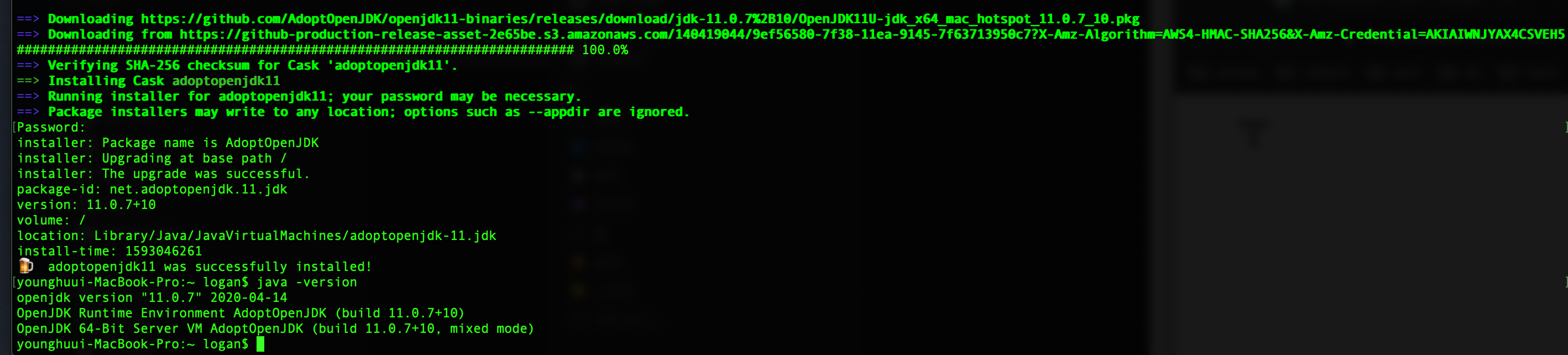 $ brew cask install adoptopenjdk11 실행 , 일련의 설치 절차가 끝나면 java -version을 통해 설치된 openjdk버전을 확인할 수 있다.