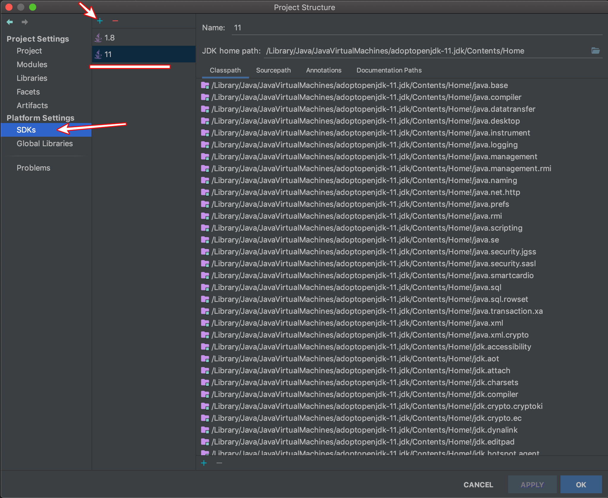 Platform Settings의 SDKs 항목에 + 를 선택 추가 , 맥의 경우 최신버전이 설치된 자바JDK경로를 자동으로 잡고 있었다.