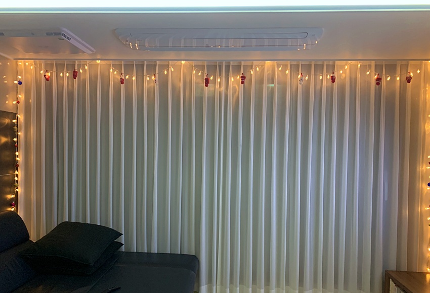 커튼은 하얀색으로 바꾼지 좀 되었고, 전구 사이 사이에 빨간색, 하얀색 양말을 달고 좌우측 전구불에는 번뜩이는 효과를 더하기 위해 반사구를 색을 교차하면서 달았다.