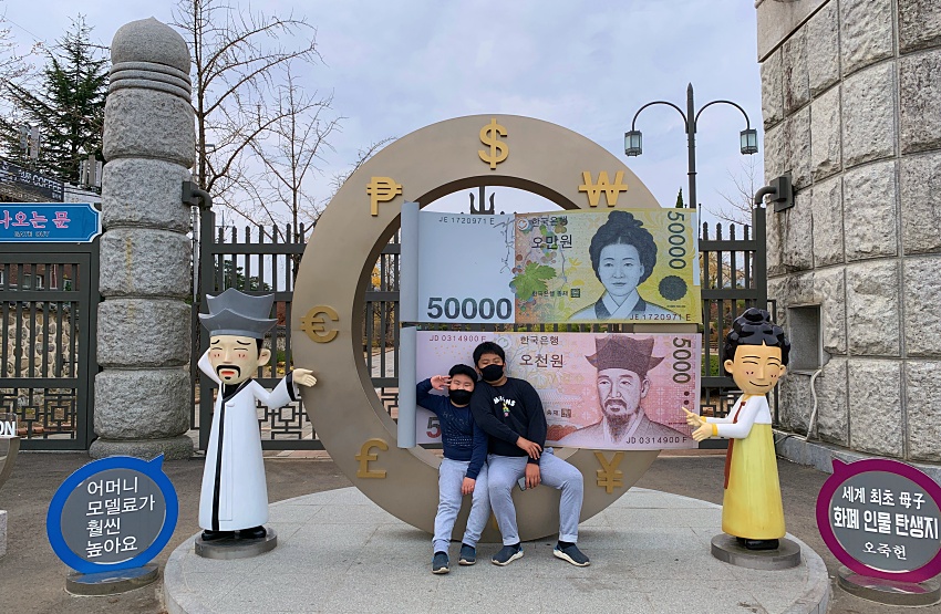 신사임당과 율곡 이이의 인증샷을 가질 수 있도록 입구부터 포토존이 준비되어 있었다. 이제 큰 놈은 사진 같은걸 잘 안찍는데 그래도 둘째는 모델을 잘 해주는 편이다.