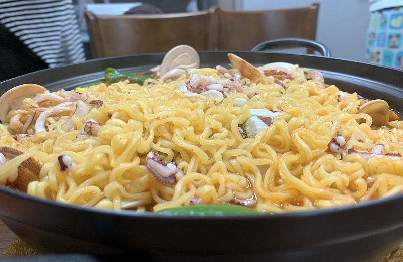 낮에 잡은 조개와 먹다 남은 회를 함께 넣고 끓인 해물라면. 배가 터지도록 먹을 수 있었다. ^^