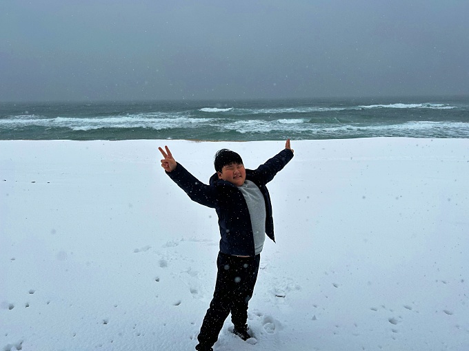 아무도 밟지 않은 지경해변, 하얀 눈으로 덮혀있다.