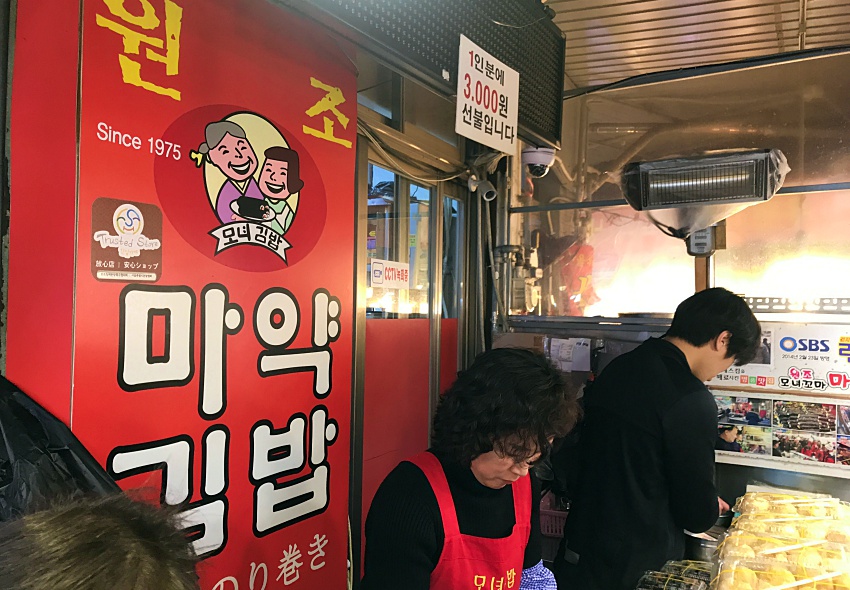 출출해진 배를 채우기 위해 광장시장에 도착하자마자 첫 번째 간식으로 모녀김밥집의 꼬마김밥을 선택했다. 김밥과 이것 저것 다른 분식을 구입해서 옆에 준비된 공간에서 먹을 수 있어 좋다. 요즘 주말에 광장시장에 가면 여기저기 맛집들은 다 줄을 서서 먹어야할 정도로 사람이 많다.