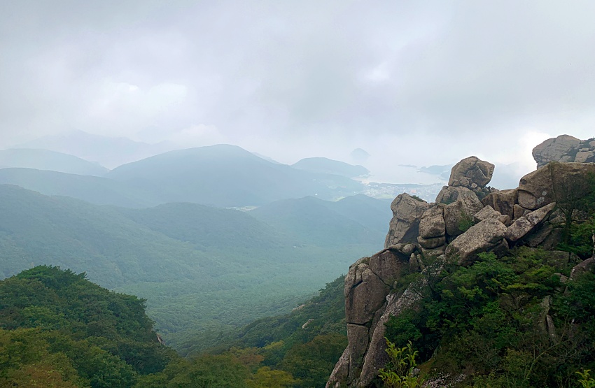 실제 시야는 이보다 더 나쁜 상태였는데 사진으로는 그나마 어느 정도는 보인다. 연말연시 해돋이 감상을 위해서 약간의 수고를 들인다면 훌륭한 해돋이를 볼 수 있을것 같다. 한려해상국립공원이 내려다 보이는데 한려해상국립공원은 1968년 12월 31일 최초해상국립공원으로 지정된 곳이다. 총면적 535.676제곱키로미터. 거제시 지심도부터 여수시 오동도까지 걸쳐 있으며 수많은 유/무인도로 이뤄진 아름다운 해양경관과 후박나무등 난대성 식물 및 수달, 산호군락 등 희귀 동식물자원이 다양하게 분포되어 있는 천혜의 자연환경을 지니고 있다고 한다.