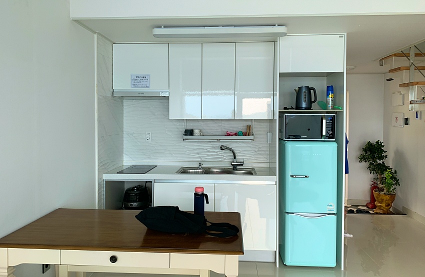 주방 모습이다. 트랜디한 냉장고도 눈에 띈다. 이곳 사장님도 원주민은 아닌듯하고 처음 내려와서 적응하는데 시간이 좀 걸렸다고 했다.