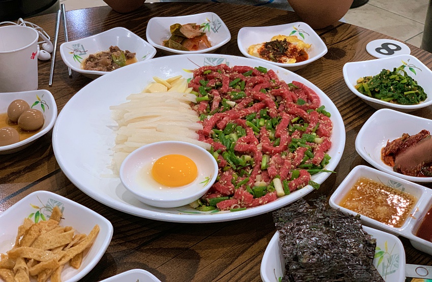 취향에 맞게 소금장에 찍어서 김에 싸 먹어도 좋고 초장에 찍어 먹어도 되고 계란 노른자 풀어 고소함을 더해도 좋다. 밑반찬들도 이질감 없이 잘 어울린다.