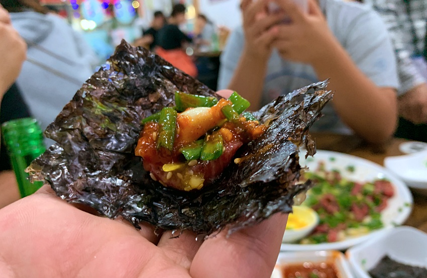 김에 올려서 소스와 함께 노른자에 찍은 육회를 올리고 소주 한잔 비우고 찹찹찹 ~