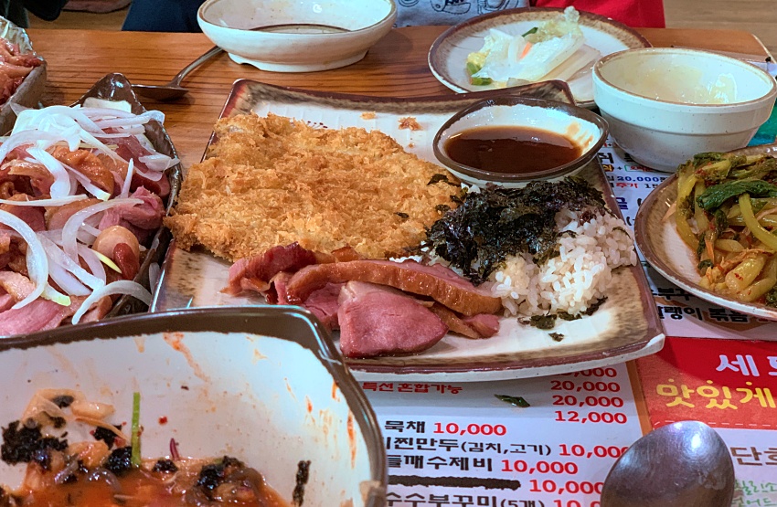 저 양도 많은데 1인 1메뉴 주문하라고 해서 돈가스도 주문했다. 그기에 또 오리훈제가 나온다. 오리...오리..오리.. 여긴 오리훈제전문점인가요? ㅋㅋㅋㅋ