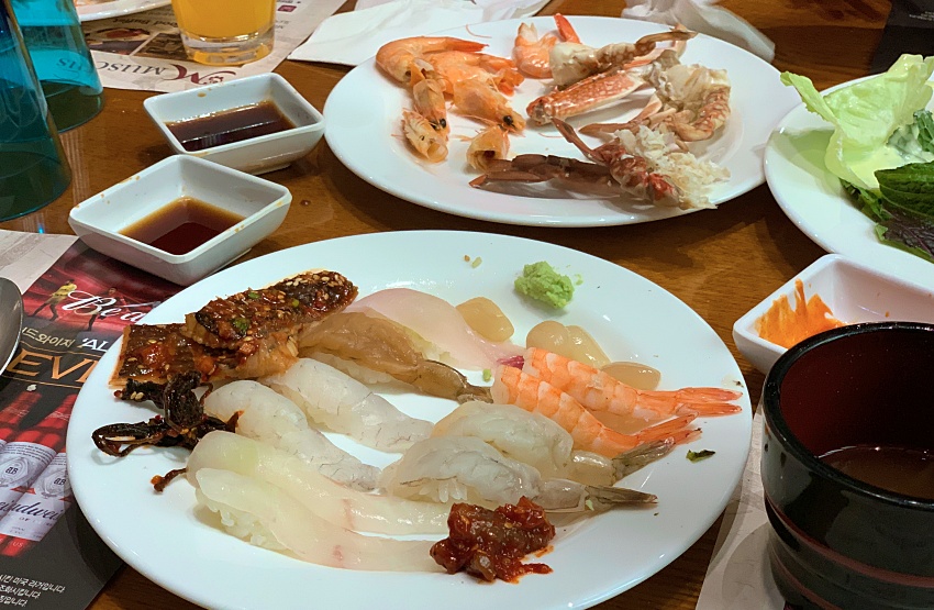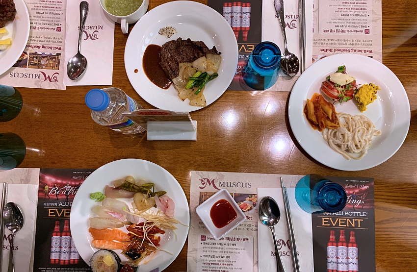 오픈한지 얼마나 된지 모르겠으나 사람이 많은 편이 아니었다. 넓고 조용해서 좋았다. 음식도 나름 깨끗하고 맛도 좋았는데 특히 무스쿠스는 초밥이 다양하다. 스테이크도 부드럽고 냉모밀도 먹을만했다. 나는 초밥을 좋아하는 편이라 꽤 많은 접시를 비운 것 같다.