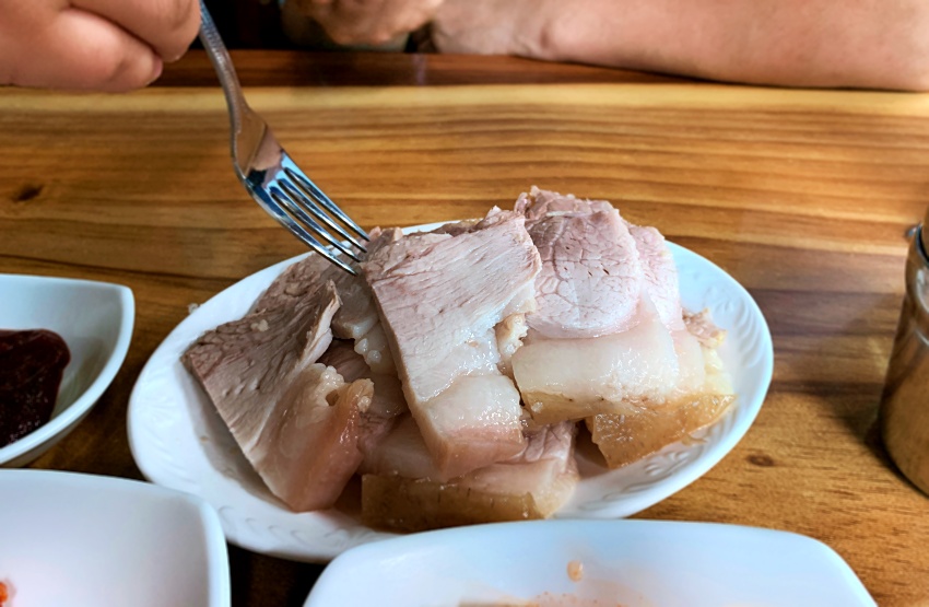 부들부들한 수육은 정말 기가 막힌다. 무심한듯 슥슥 썰어 접시(사라)에 담아 주는데 보는 것만으로도 침이 고인다. 겨자와 양념장을 바르고 밀면과 함께 싸서 제주 막걸리 한 모금 마시고 털어 넣으면 그 오묘하고 풍미 가득한 맛을 입안 가득 느낄 수 있다.