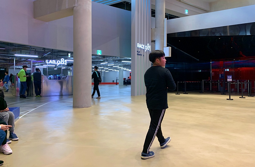 위에서 내려다 본 모습. 아이들은 뛰어 다니고 공간은 사이버틱하다. 탑승을 위해 대기하는 공간인데 탑승절차, 앱설치, 이용방법등을 친절하게 설명해주었다.