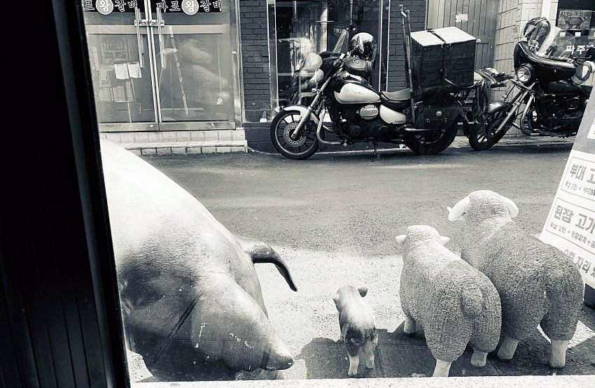 식당앞에 자리 잡은 돼지, 양, ㅋㅋㅋ