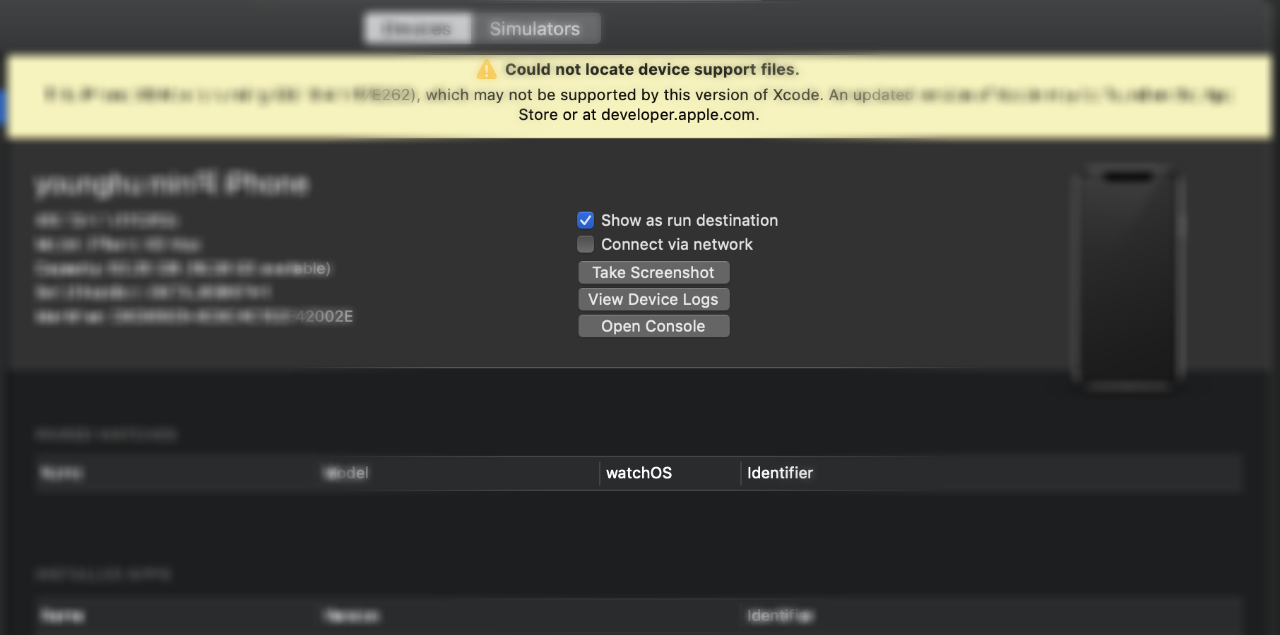 역시 개발하는 일에는 크게 문제가 되지 않는데 아이폰으로 바로 빌드 & 실행이 안되는 문제가 있다. iOS버전보다 Xcode버전이 하위버전이라 호환되지 않을 수 있다고 한다.