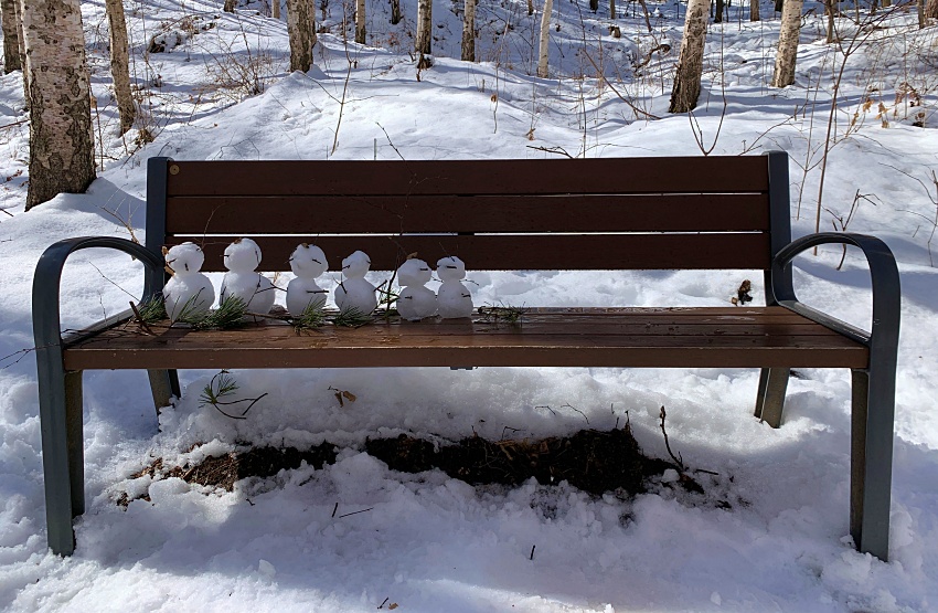벤치에 앉을 수는 없지만 대신 꼬마 눈사람들이 휴식 중이다.