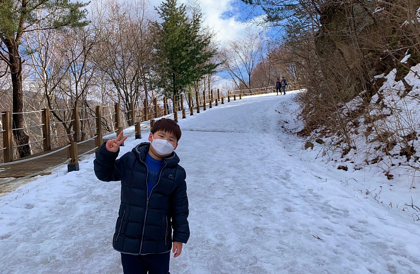 하는 수 없이 막내 녀석만 데리고 손을 잡고 끌고 올라갔다. 마스크를 하고도 잘 올라간다. 이때까진 좋았다. ㅎㅎ