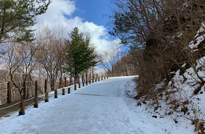 주차장에 주차를 하고 길을 건너 입구에 도착하니 입구쪽은 기온이 높아 눈이 대부분 놓았고 질퍽질퍽한 길이 우리를 맞이했다. 이내 아이들과 아내는 눈살을 찌푸덩거리며 왜 여길 올라가야하냐고 타박이다. 그래도 저기 앞에 보면 다정한 연인이 이 질퍽한 길에도 손을 꼭 잡고 잘 올라가고 있지 않은가? 우리라고 올라가지 못할 이유는 없다. ㅋㅋㅋ