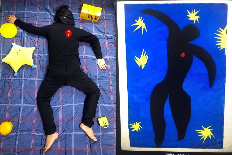 아침 일정을 끝낸 아내로부터 사진 두 장이 도착했다. 이건 뭐지? 라고 생각했는데 '마티스 이카루스' 라는 작품 사진 한 장과 눈에 익은 아들 녀석의 뒷태(?)가 찍힌 사진인데 묘하게 앞 사진과 닮은 것이다.