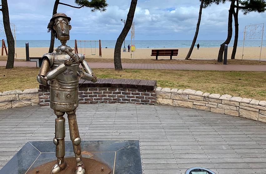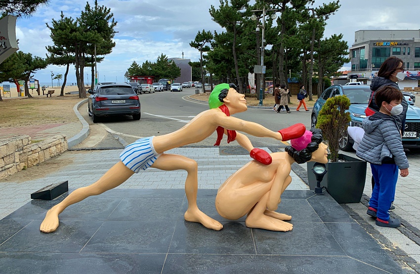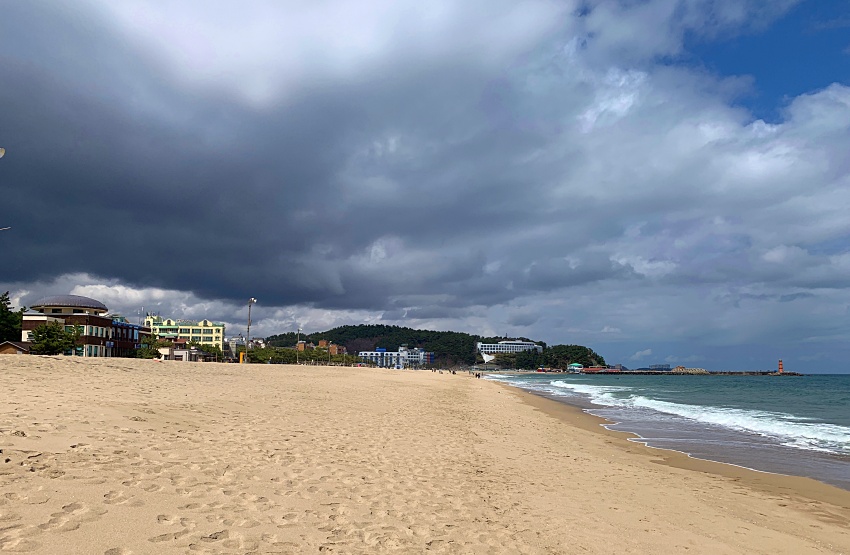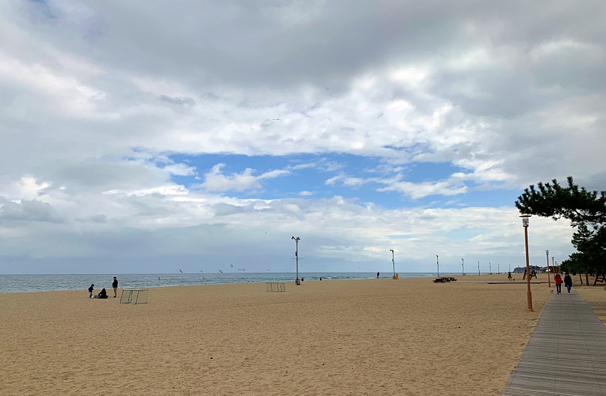 멀리 낙산사가 보이고 더 넓은 해변가에는 인적이 드물다. 코로나19 여파가 아닌가 싶다.