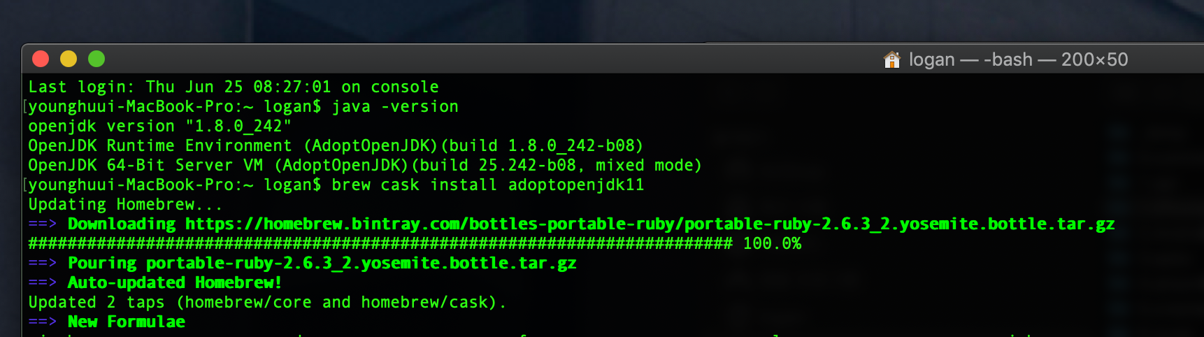 $ brew cask install adoptopenjdk11 실행 , 일련의 설치 절차가 끝나면 java -version을 통해 설치된 openjdk버전을 확인할 수 있다.
