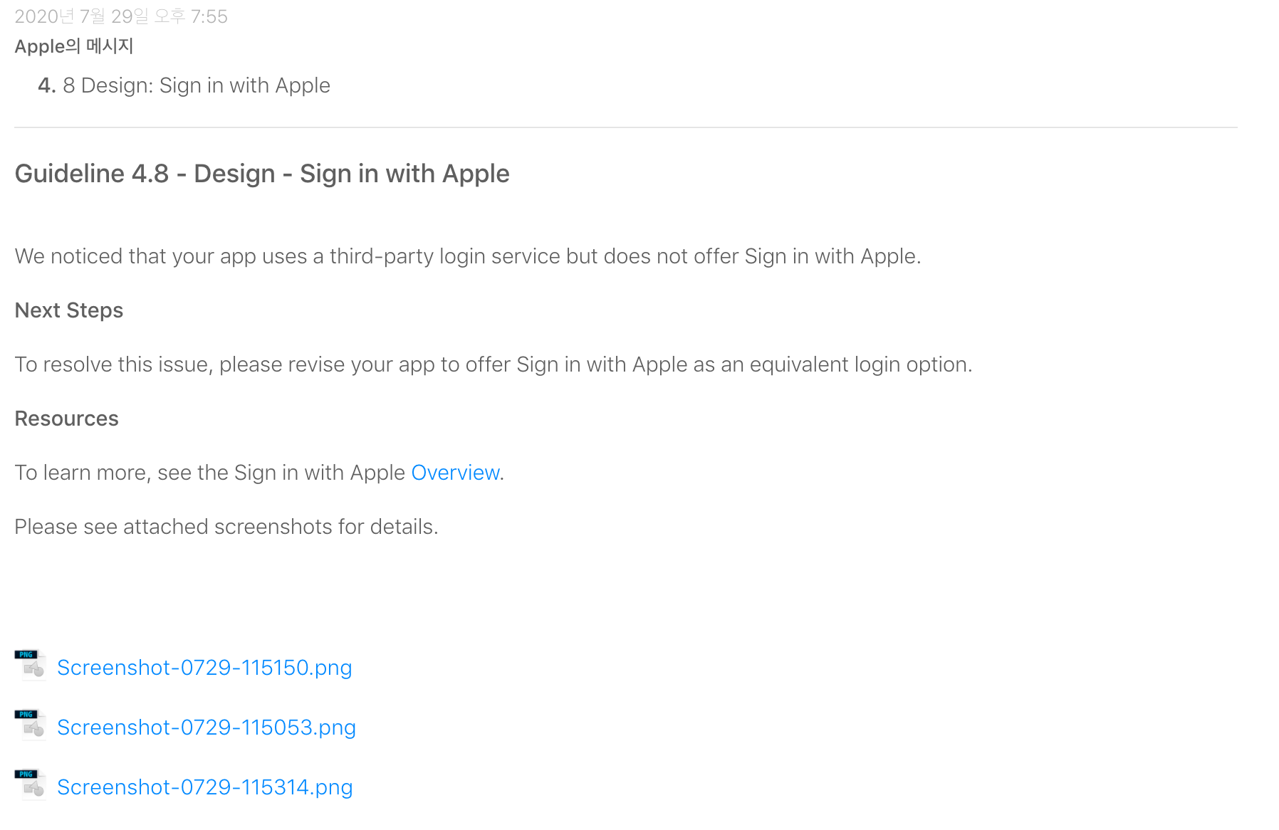 정확하게 사용하는 위치를 스크린샷으로 찍어 보냈다. Apple 로그인을 반드시 넣어야 한다는 이야기다. .지난 4월까지에서 6월까지 유예기간을 두었고 7월부터 업데이트 되는 앱은 반드시 함께 적용을 해야 한다고... 덴장.