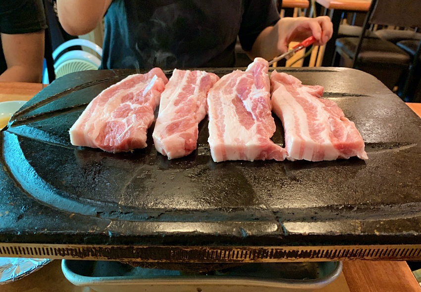 두툼한 생삼겹살을 돌판에 구워 먹는 맛은 굳이 말로 설명이 필요없다. 지글지글 기름기 쪽 빼면서 도툼한 삼겹살과 구운 김치, 그리고 소금.