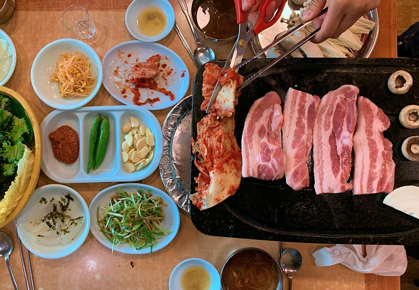 푸짐한 한 상차림으로 맛있게 구워 먹었던 삼겹살. 이후 금요일 저녁이 되면 동네 여기저기 삼겹살집에서 외식을 하고 있다.
