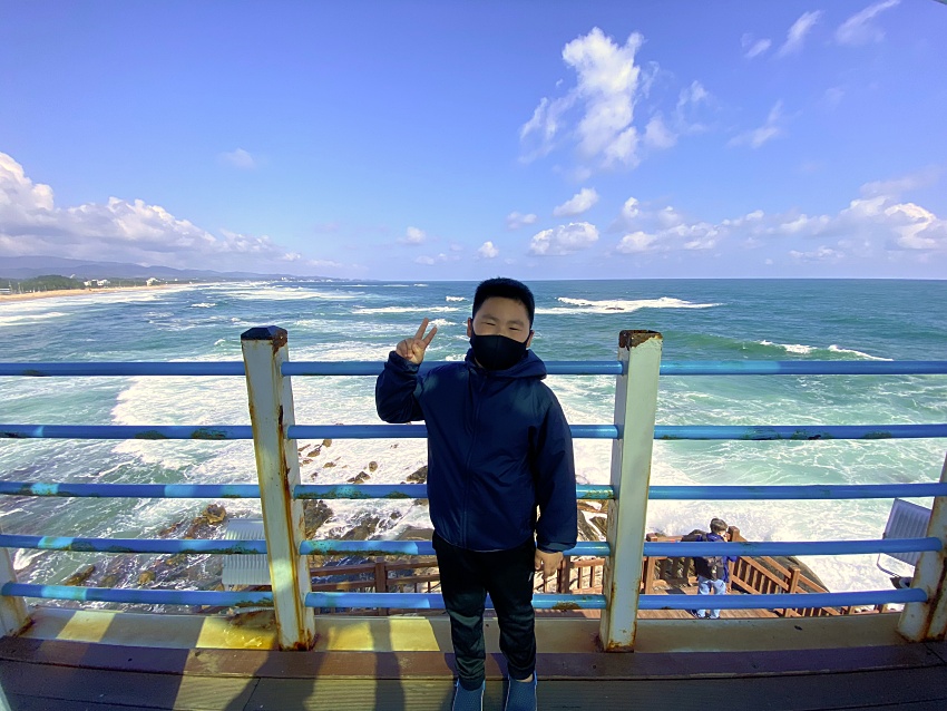 주문진해수욕장을 조금 지나쳐 해안도로를 따라 가다보면 절경이 기가막힌 곳이 나온다. 갓길에 차를 바로 세우고 '와' 감탄사를 연발하면서 아이들과 다함께 차에서 내렸다. 아내의 아이폰11Pro를 가지고 사진을 찍다보니 광각의 매력에 사로잡혔다. 탁 트인 드 넓은 주문진해수욕장을 뒤로 하고 멋지게 포즈를 취했다.