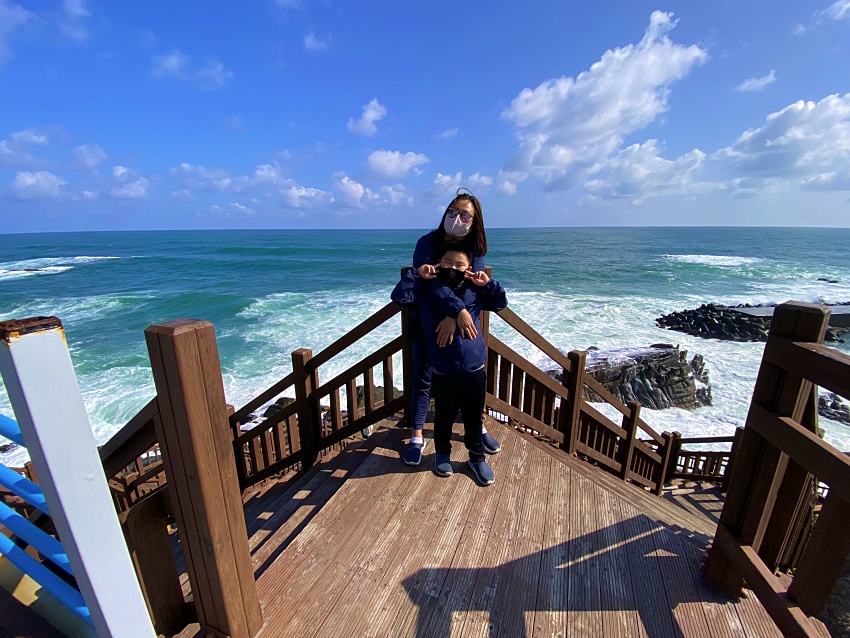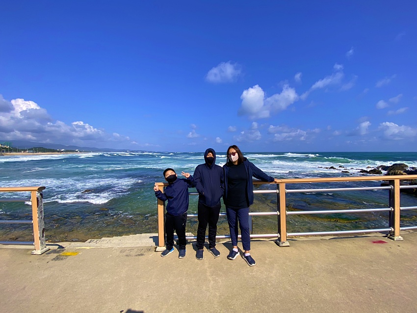 주문진해수욕장을 조금 지나쳐 해안도로를 따라 가다보면 절경이 기가막힌 곳이 나온다. 갓길에 차를 바로 세우고 '와' 감탄사를 연발하면서 아이들과 다함께 차에서 내렸다. 아내의 아이폰11Pro를 가지고 사진을 찍다보니 광각의 매력에 사로잡혔다. 탁 트인 드 넓은 주문진해수욕장을 뒤로 하고 멋지게 포즈를 취했다.