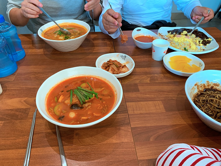 짬뽕의 맵기 조절이 가능한 줄 모르고 전날 먹은 숙취로 무조건 짬뽕을 주문하고 앉아 있었다. 아이들은 짜장, 볶음을 주문하고 음식을 기다리며 식당안을 둘러보았다.