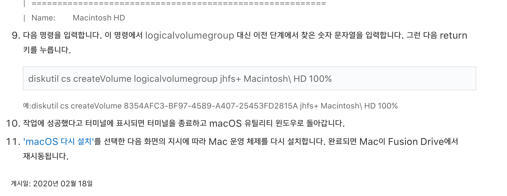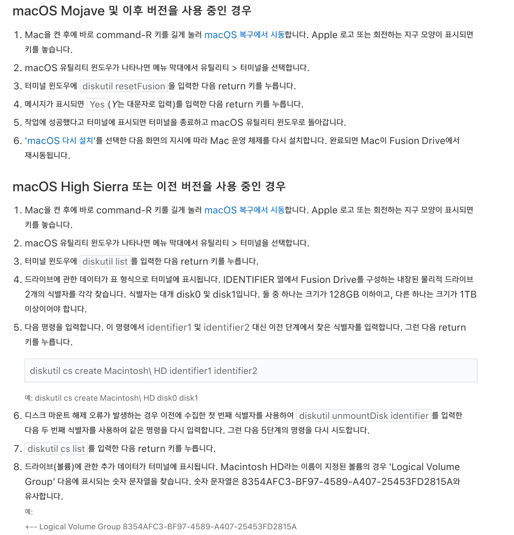 애플 지원센터에서 현재 설치되어 있는 버전에 맞는 맥 퓨전드라이브 수정에 대해 친절하게도 가이드하고 있다.