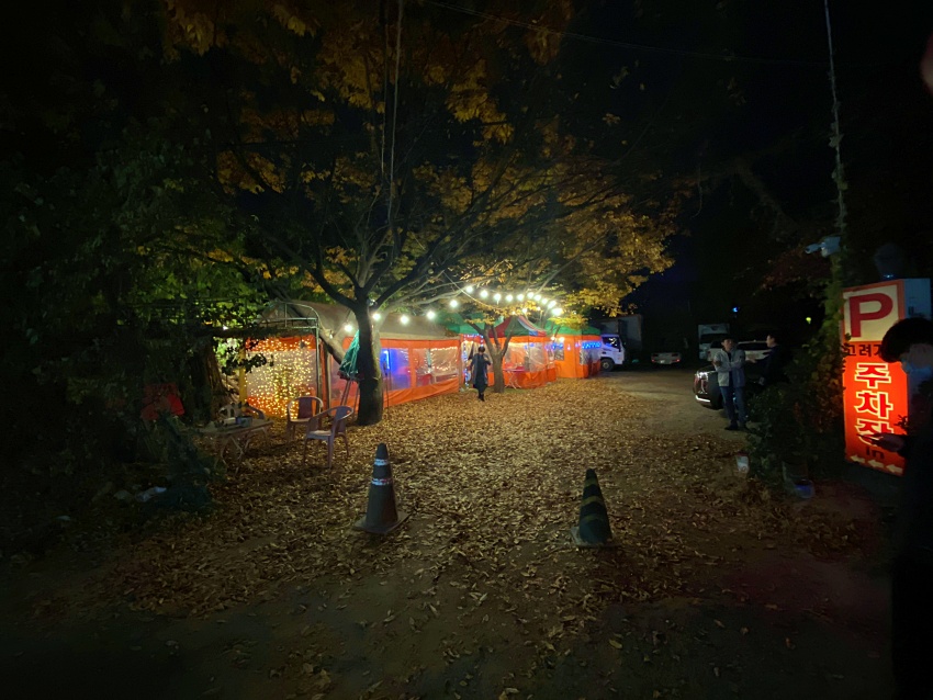 '포차' 라는 간판이 하나 있고 울창한 나무담벼락뒤로 붉은 천막으로 만들어진 포차가 살짝살짝 보인다. 길 건너는 연산군묘가 위치하고 있다.