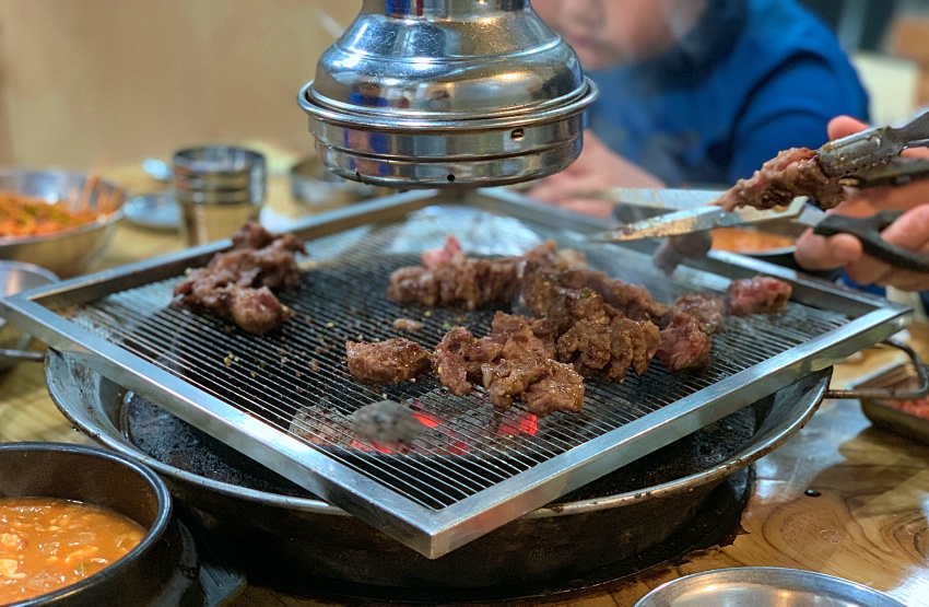 촉촉하게 양념이 되어 있는 불고기가 불판에 오르면서 치이익 ~ 소리르 낸다. 즉 맛있는 소리가 난다.
