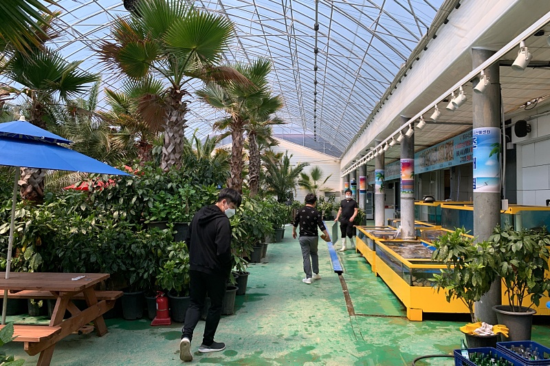 식사를 하는 곳은 대형 비닐하우스 내, 식물원같은 곳에서 귤나무, 야자수, 바나나나무 등을 재배하고 있고, 우측에 보이는 곳이 식당칸들이다. 식사 후 잠시 걸을 수 있지만 그렇게 넓지않고 볼게 많지 않다. 그래서 패싱.