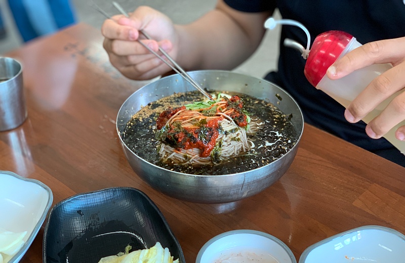 물막국수에는 설탕을 덤뻑 넣고, 식초도 좀 넣고 잘 저어서 적당히 섞어주면 마법의 맛이 나온다. 냉면, 막국수 등을 먹을 때는 식초를 많이 넣는 편인데 아이들은 질색을 하곤 한다. 시원한 맛을 가중하는 식초가 없으면 맹맹하니 맛이 없다.