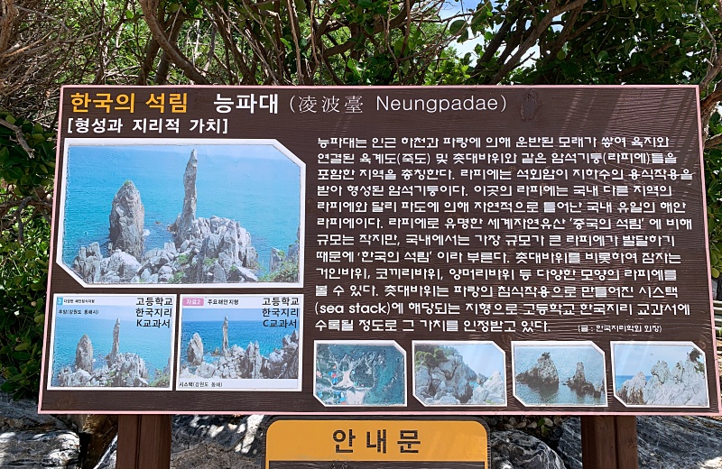 능파대(Neungpadae)는 인근 하천과 파랑에 의해 운반된 모래가 쌓여 육지와 연결된 육계도(죽도) 및 촛대바위와 같은 암석기둥(라피에)들을 포함한 지역을 총칭한다 라고 적혔이따.