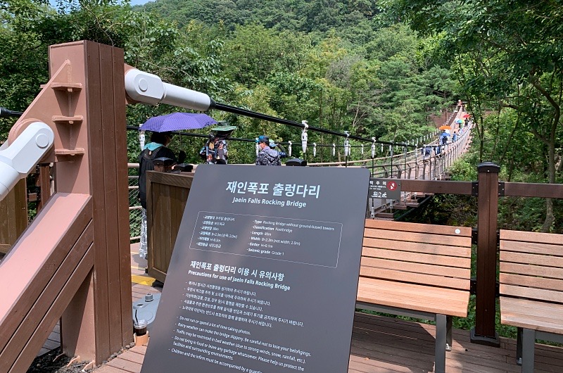 주차장 주차를 하고 데크길을 걸으면서 가다보면 재인폭포와 출렁다리를 조망할 수 있는 전망대가 있는데 많은 분들이 그 곳에서 사진을 찍었다. 다른 분의 블로그를 보니 작년 비슷한 시기에 갔던 것 같은데 재인폭포 아래까지 내려가 관람하는 하는 분들도 있는 걸로 바서, 개방하는 일이 따로 있는 듯 하다. 잘 알아보고 가면 좋을 듯 하다.