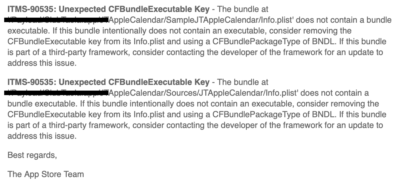 0.0.1, 1 빌드 버전을 배포하려고 아카이브를 하니 아래와 같은 메일이 날라왔다. 인터넷 검색을 해보니 유니티 프로젝트에서도 저런 현상이 있는 듯 하여 해결한 분의 포스팅을 보고 따라 해결하였다.