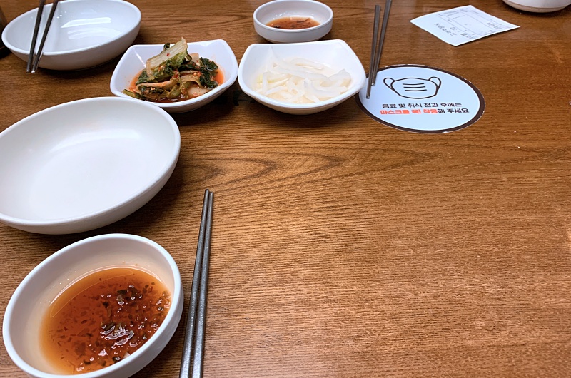 만두를 찍어먹는 간장과 기본 반찬이 나왔다.
