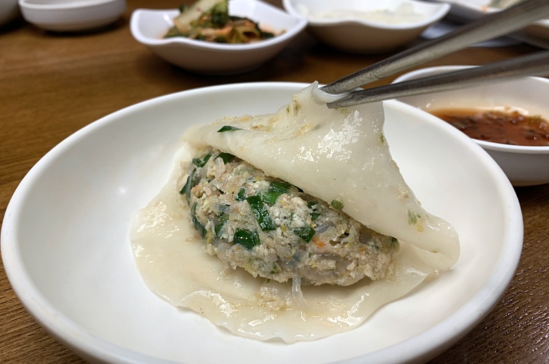 만두피가 어찌나 부들부들한지 젓가락으로 살짝 들추니 속이 훤히 보인다.