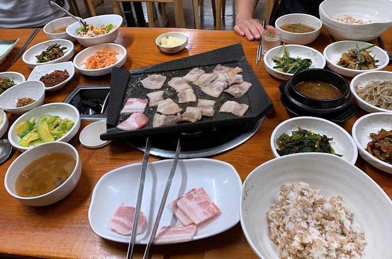 냉동삼겹을 기름 잘 빠지는 불판위에서 굽고 갖은 채소 나물과 절로 건강해지는 보리밥.