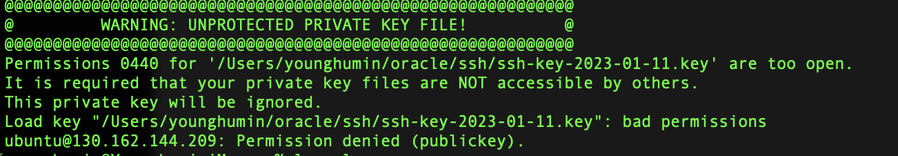 집에서 하려고 하니 퍼미션 오류가 나서 사무실있는 인증서 파일을 집으로 가져와 동일 경로를 만들고 ssh로 접속하려고 하니 다음과 같은 오류가 나왔다.