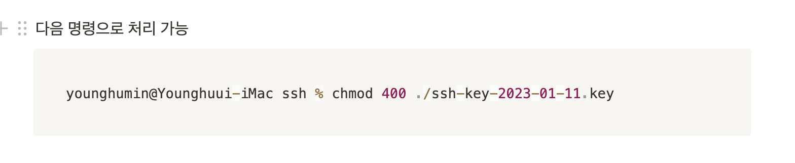 $ ssh % chmod 400 ./ssh-key-2023-01-11.key 해당 키의 권한을 제한하는 명령을 수행하였다.