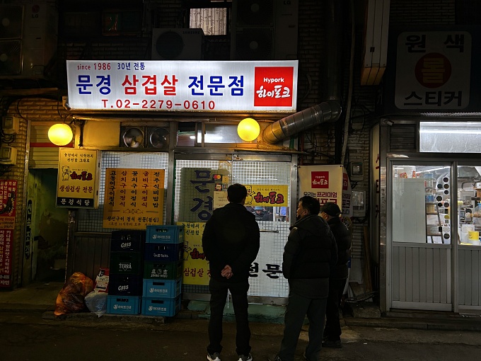 먼저 와 기다리는 선배와 만나 찾아 간 곳은 문경삼겹살전문점. 그런데 이미 만석이고 대기줄까지 있었다.