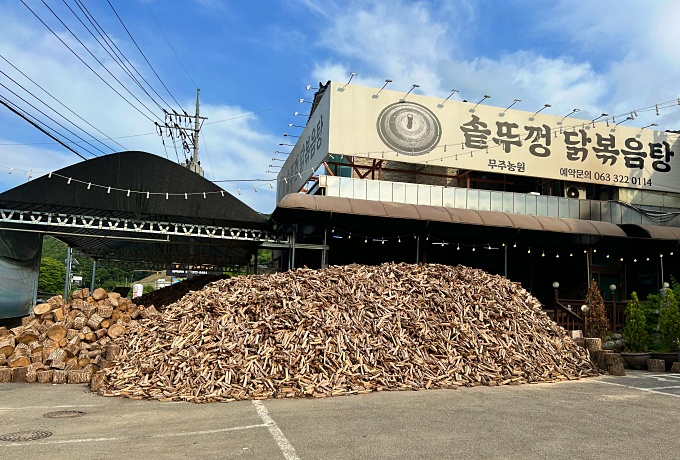 산더미 같이 쌓인 장작을 보고 한번 놀라고 그 뒤쪽에 마치 용광로에서 철을 만드는 듯한 풍경으로 착각할 정도로 뜨거운 불길에서 닭볶음탕을 만들고 있는 모습에 놀랐다.