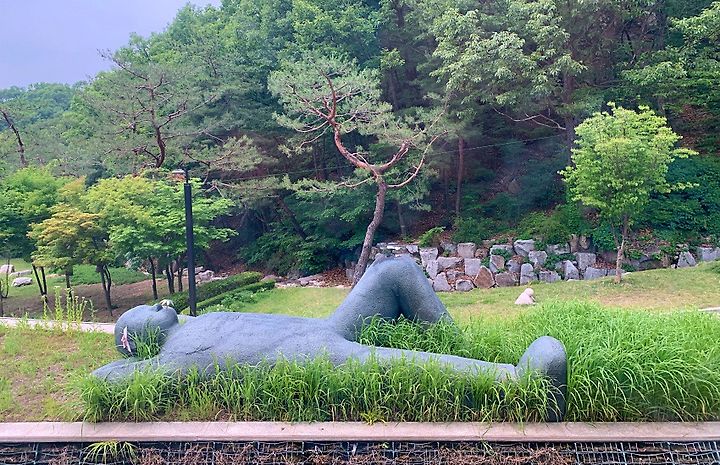 모노레일 타고 가다 밖을 내다 보면 세상 좋은 조각상이 입에 꽃을 물고 하늘을 바라보며 태평스럽게 누워 있다.