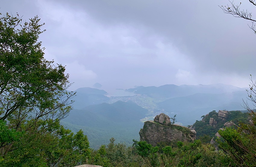 실제 시야는 이보다 더 나쁜 상태였는데 사진으로는 그나마 어느 정도는 보인다. 연말연시 해돋이 감상을 위해서 약간의 수고를 들인다면 훌륭한 해돋이를 볼 수 있을것 같다. 한려해상국립공원이 내려다 보이는데 한려해상국립공원은 1968년 12월 31일 최초해상국립공원으로 지정된 곳이다. 총면적 535.676제곱키로미터. 거제시 지심도부터 여수시 오동도까지 걸쳐 있으며 수많은 유/무인도로 이뤄진 아름다운 해양경관과 후박나무등 난대성 식물 및 수달, 산호군락 등 희귀 동식물자원이 다양하게 분포되어 있는 천혜의 자연환경을 지니고 있다고 한다.