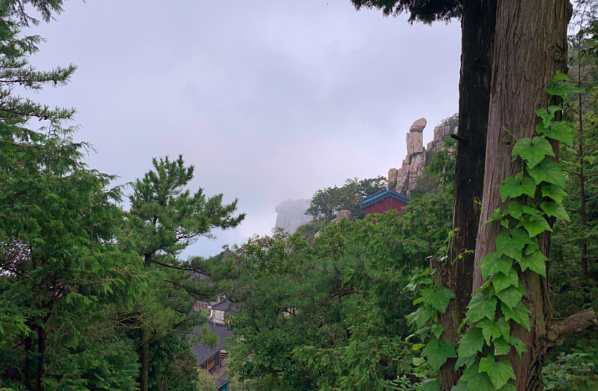 우선 첫번째 목적지는 금산산장이다. 이곳을 텔레비젼으로만 바 오던 곳이라 그 곳에서 컵라면을 먹는 것이 목적이었기때문에 아이들을 꼬드여 여기까지 온 것 아니겠는가. 보리암 주변으로 안개가 짖게 피어올라와있다.