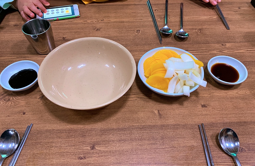 짬뽕에 홍합이 들어있기 때문에 홍합껍질을 발라 놓는 빈 대접이 하나 나오고 단무지와 양파는 덤뿍 담아 주신다. 군마두도 함께 먹기 위해 간장을 준비했다.