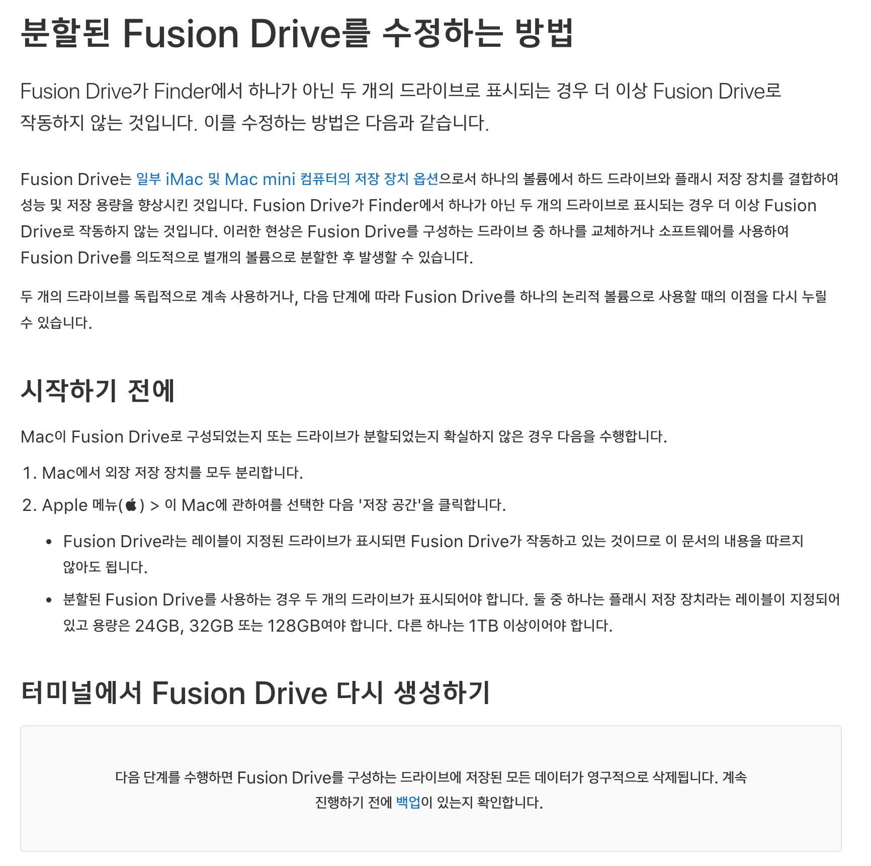 애플 지원센터에서 현재 설치되어 있는 버전에 맞는 맥 퓨전드라이브 수정에 대해 친절하게도 가이드하고 있다.